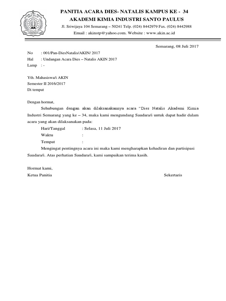 Contoh Surat Undangan Dies Natalis Kampus - Formadiksi Um Undangan Dies Natalis Ke 63 Um ÙÙØ³Ø¨ÙÙ / Jun 28, 2021 · surat undangan kepada para pengurus bem ui resmi dibuat pada minggu 27 juni 2021 dan ditandatangani direktur kemahasiswan ui tito latif indra.